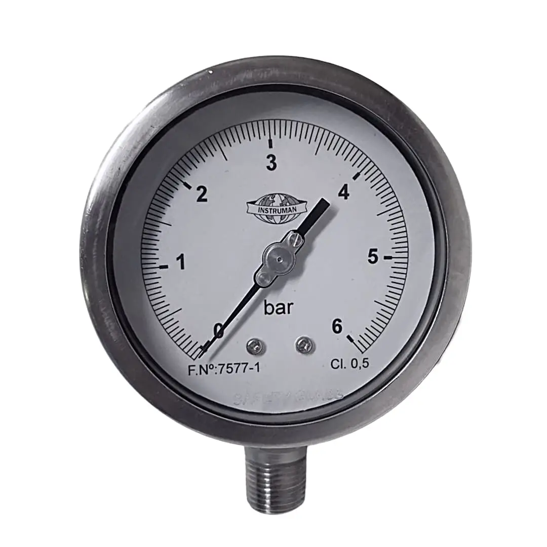 Manómetro totalmente acero inoxidable, cierre bayoneta, hermético, apto para baño de glicerina, cierre bayoneta, Cl. 0,5 o Cl. 1. Eslala simple o doble, diferentes rangos y unidades de medida. Diámetros 63 mm, 100 mm, y 150 mm.