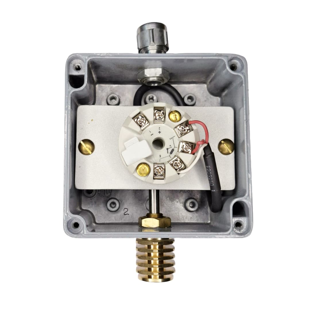 Sensor PT-100, encapsulado en tubo de acero inoxidable, con cabezal de borneras de aluminio, para montaje adosado.